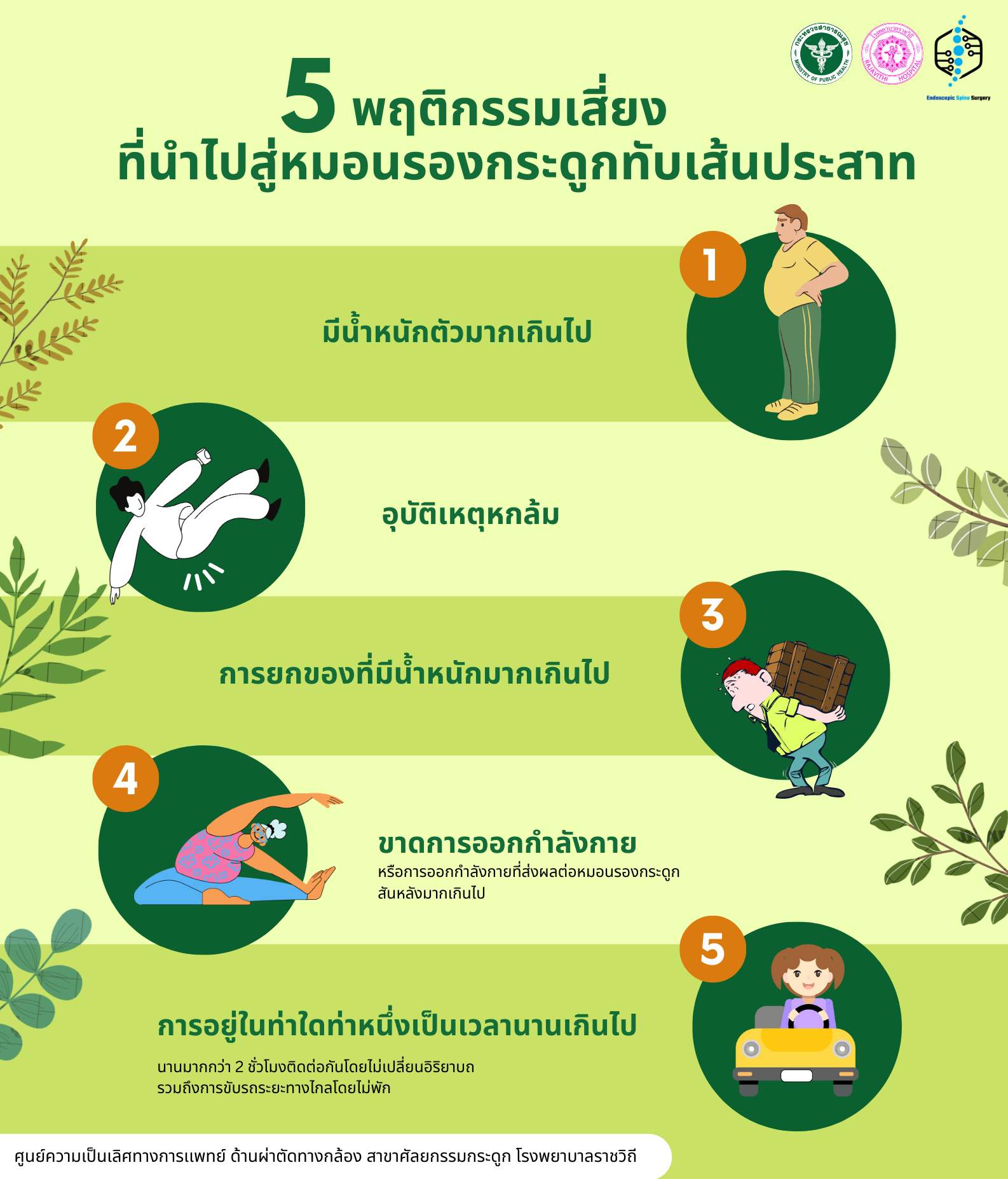 - ขาดการออกกำลังกาย หรือการออกกำลังกายที่ส่งผลต่อหมอนรองกระดูกสันหลังมากเกินไป